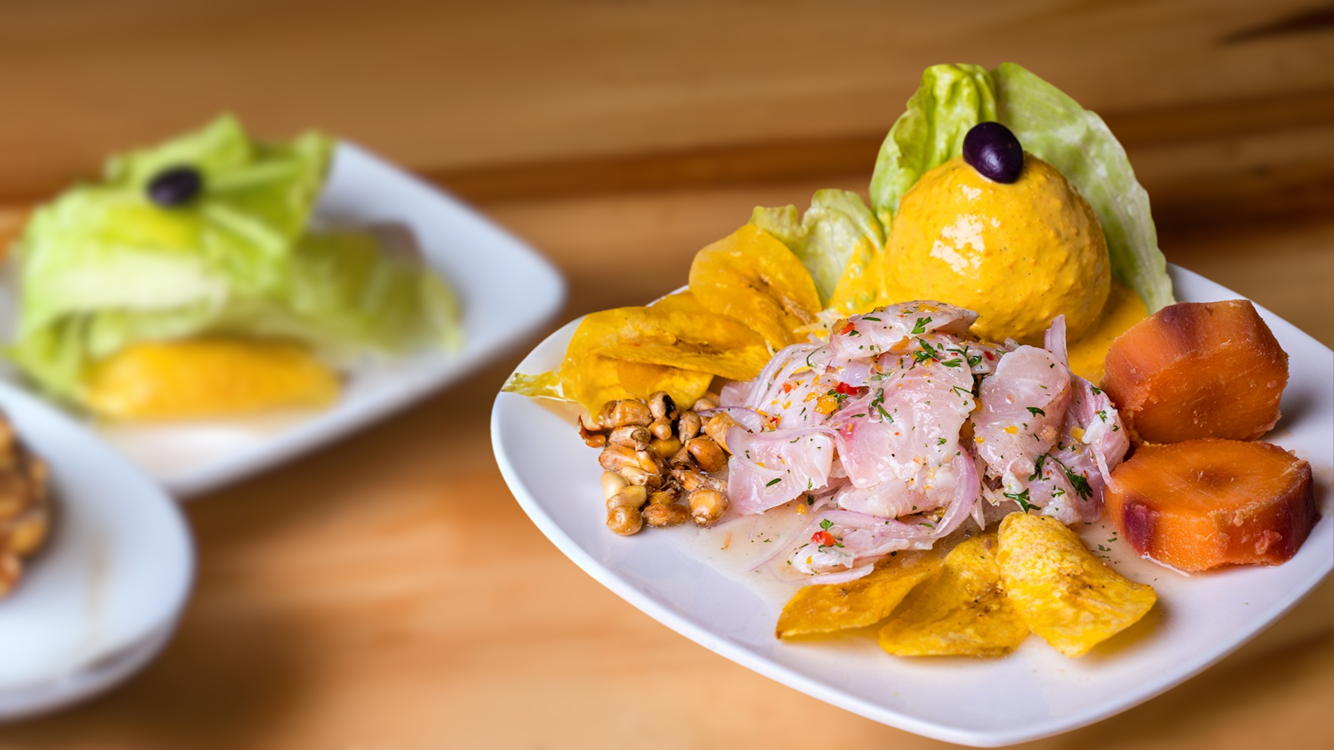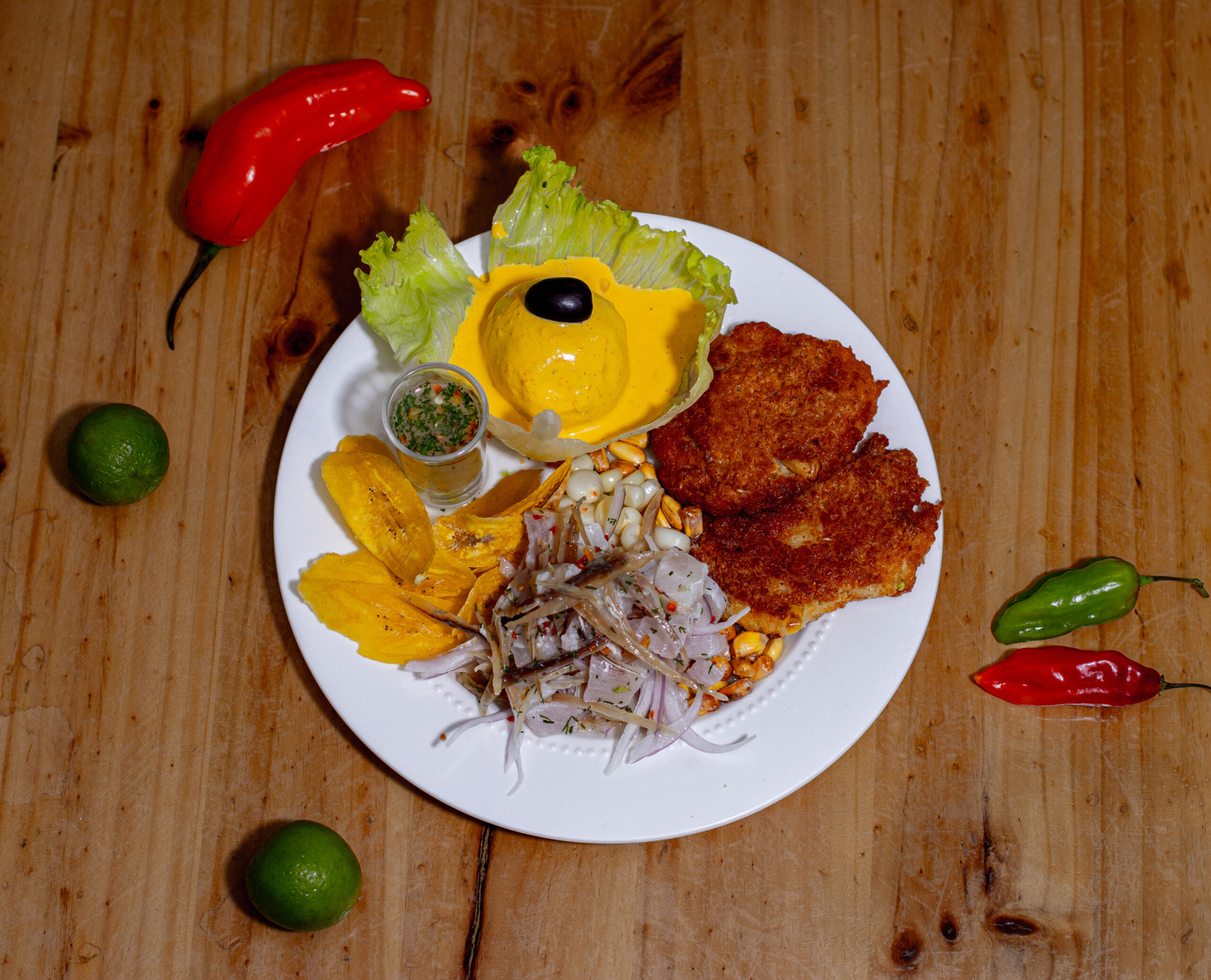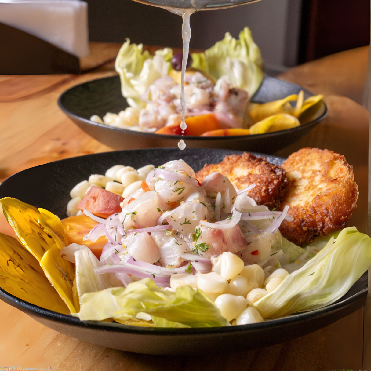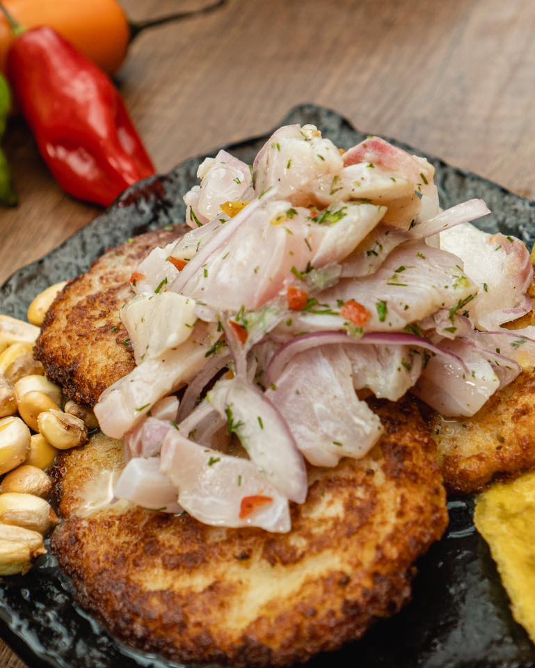 Torrejitas de Yuca con Ceviche y Chifles